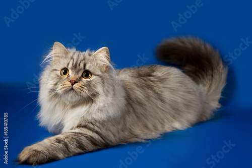 Scottish Straight Silver Tabby Spotted Long Hair Kitten Lying Blue