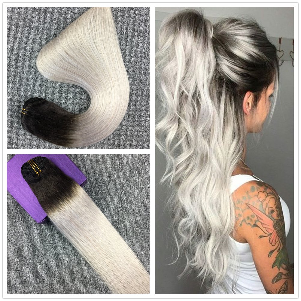 Full Shine Dip Dye Hair Ombre Color 1b Silver Clip In Human Hair